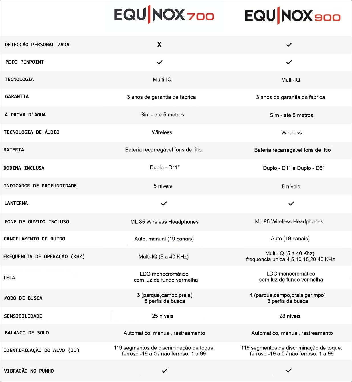 O Equinox 900 possui tanto lanterna externa como luz de fundo no display, possibilitando prospectar no período noturno, o Equinox 900 tambem possui o modo Vibração que possibilita pessoas com deficiência auditiva também desfrutar do hobby.